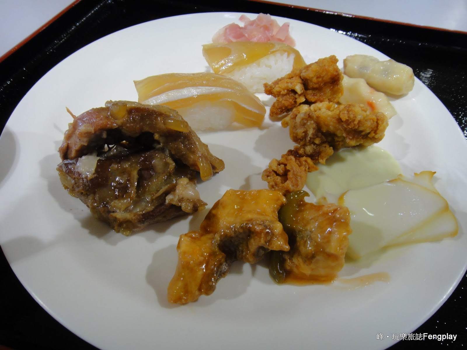 ▲午餐與早餐時間太近,說真的吃不太下,所以挑了生魚片壽司、紅燒魚、炸雞肉、排骨。