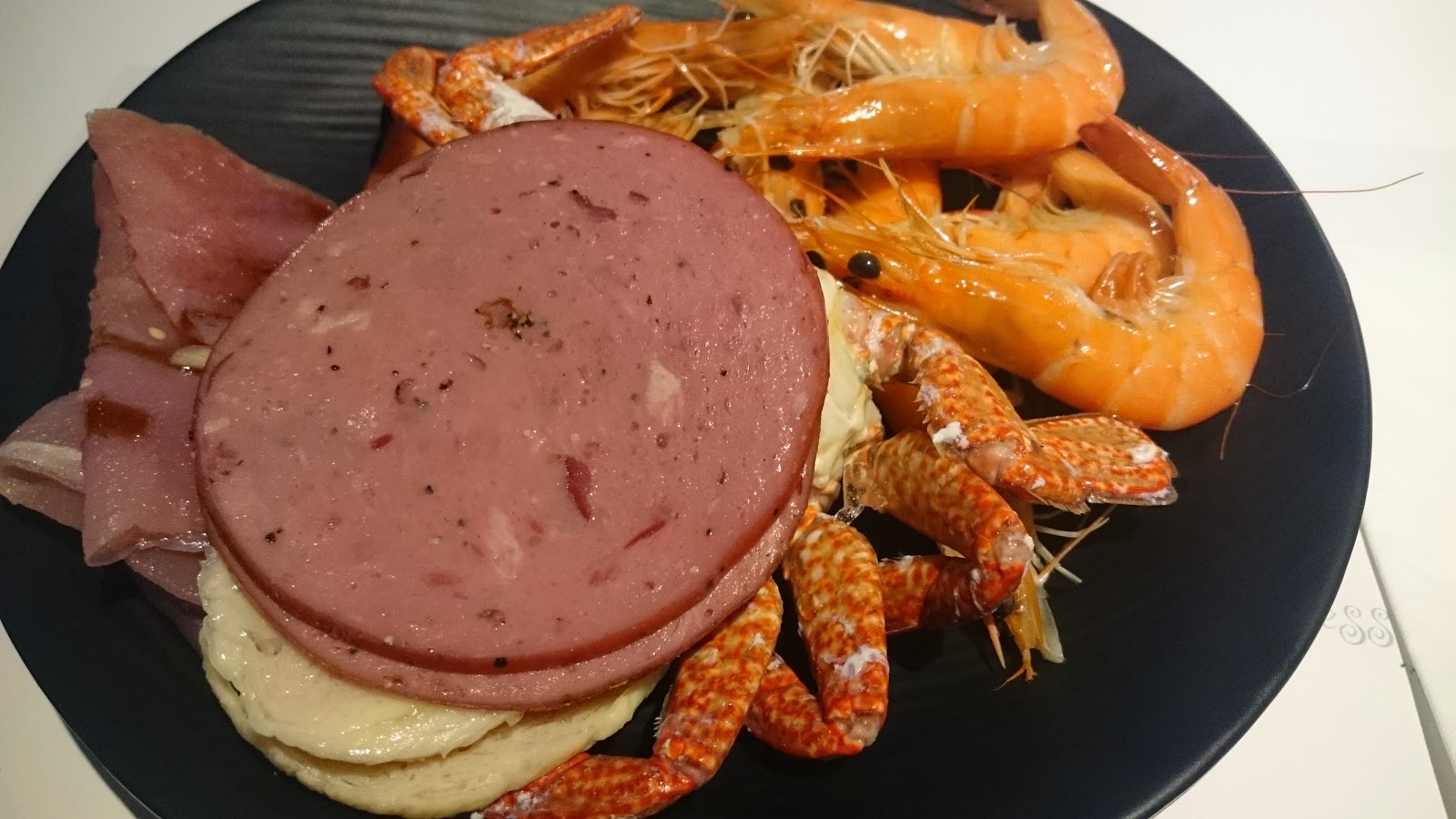 ▲我夾了滿滿的一盤有蝦子、螃蟹、燻鮭魚、火腿。