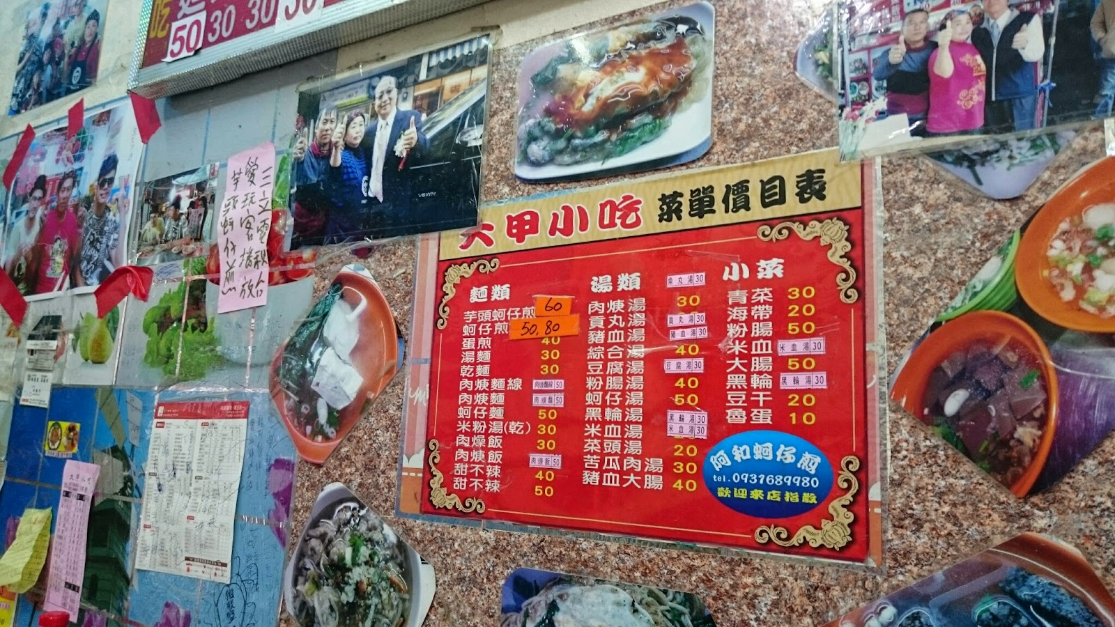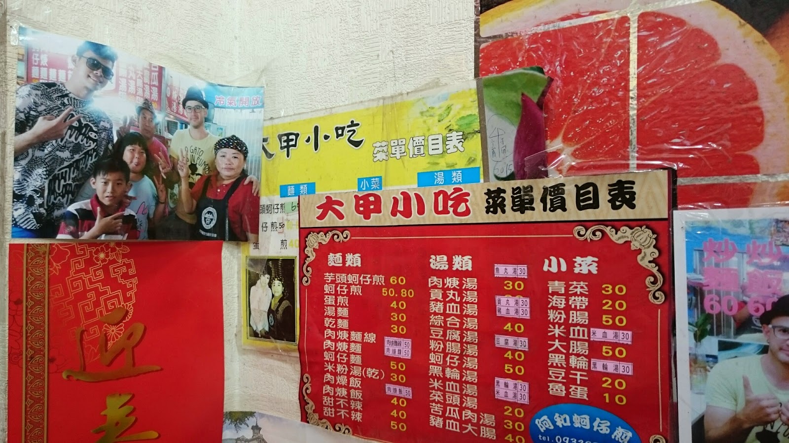 ▲ 這一張小張的有寫,而且菜單比較多,牆上貼滿名人與老闆、老闆娘的合照。
