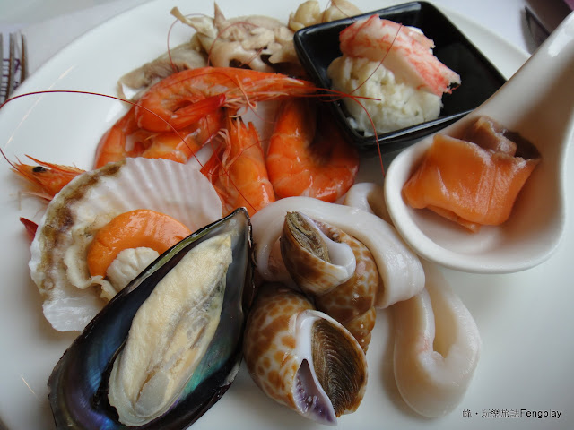 ▲這次首先先拿海鮮類,有鮮蝦、扇貝、淡菜、風螺、魷魚、煙燻鮭魚。